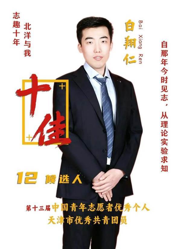 白翔仁,中共党员,材料学院2020级博士生,他是天津市优秀共青团员,第二批“全国百个研究生样板党支部”成员,他曾是校团委青年志愿者中心主任,第十二期“太雷班”成员,被共青团中央、中国青年志愿者协会评为第十三届“中国青年志愿者优秀个人”,以唯一第一作者在“Nature Materials”刊发表论文一篇。