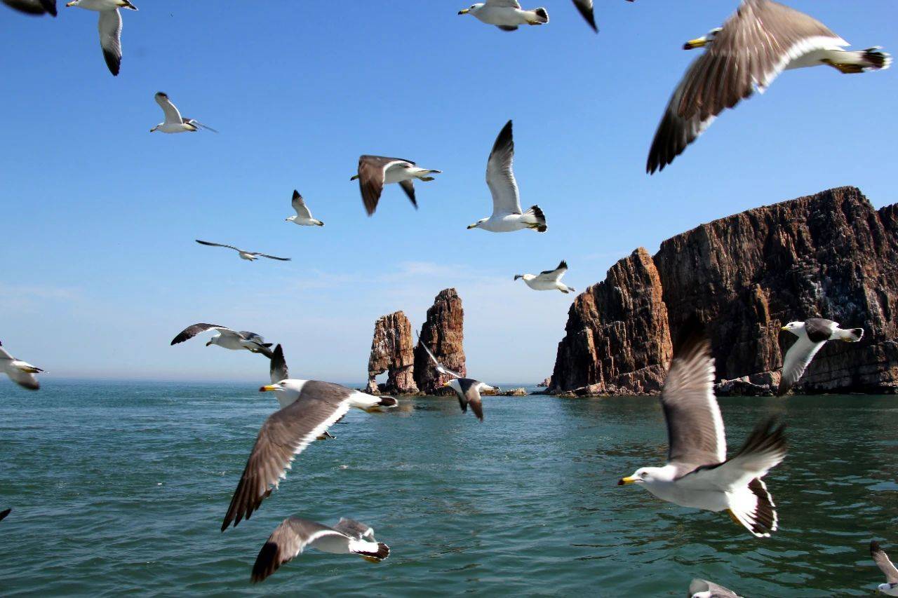 11:00左右,船只驶过大小黑山岛,成群的海鸥在空中盘旋,追船飞翔。大黑山岛上,风化和海蚀作用形成的天然“栈道”、北庄史前遗址等自然和文化遗产被完整保存,成为慕名而来的游客“打卡点”。11:30,悠长的汽笛声再次响起,“和航成龙”轮缓缓驶入长岛港。