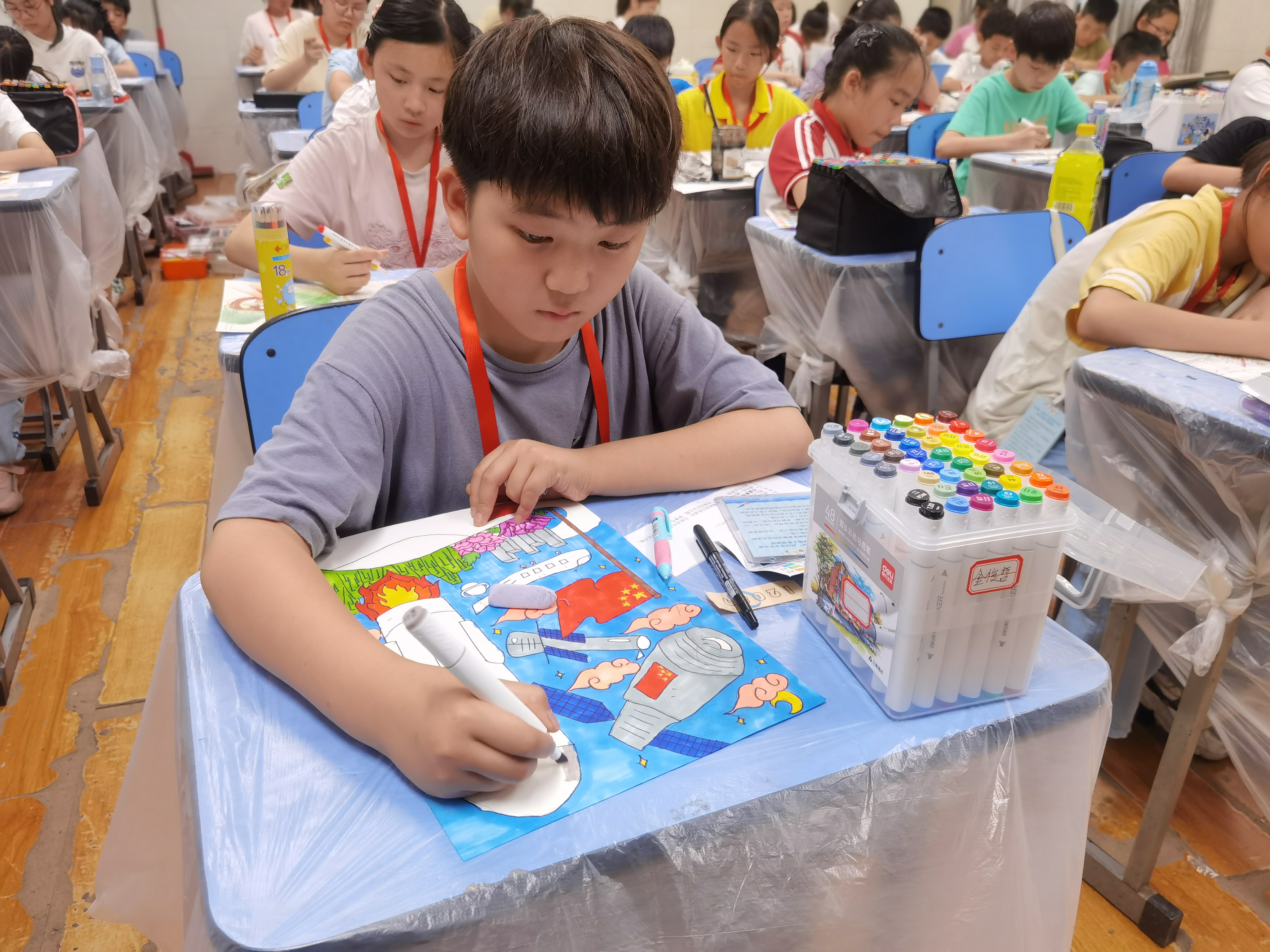 充满想象的中国画、水彩画,肆意挥洒的行书、隶书、篆书、楷书,刚劲有力的硬笔诗文……比赛现场,千余名少年儿童飞扬笔墨,放飞想象,以独特方式厚植家国情怀,树立远大理想,展现爱党爱国、自立自强、奋发向上的新时代少年风采。杨春湖实验小学403班的徐毅博所书写的作品“心怀梦想 追求无限”字迹清晰流畅,结构严谨,笔法遒劲有力,传递出新时代少年对于梦想的执着追求及有关未来的无限憧憬。年仅四岁的刘妤浠第一次参加该比赛,她兴奋地表示:“我画的是我心中的祖国,有湛蓝的天空,高高的大楼,还有那抹最亮丽的中国红。我希望祖国越来越美丽,我也要努力学习,长大后为祖国做贡献!”