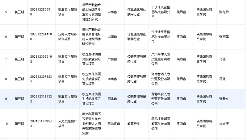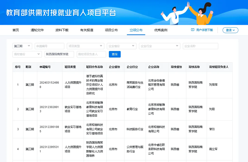 6月14日,教育部高校学生司发布了《关于公布第三期供需对接就业育人项目立项名单的通知》(教就业司函〔2024〕23号)。陕西国际商贸学院与合作企业联合申报项目22项,最终立项16项。其中,就业实习基地项目9项、人力资源提升项目6项、定向人才培养项目1项,为近年来学校此类型项目获批数量最多。