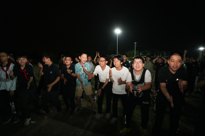 精彩仍在继续。晚上,全体人员来到老山红色教育基地,开展了一系列丰富多彩的活动——篝火晚会、搭帐篷露营、团队游戏等活动,不仅增进了师生之间的感情,也锻炼了孩子们的团队协作能力。深夜,尽管下起了小雨,但在教官的指挥下,大家迅速行动起来,收起帐篷列队回到房间。这一经历也让孩子们深刻体会到,成长的路上不仅有风和日丽,也会有风霜雨雪,只要勇敢面对,就一定能战胜一切困难。