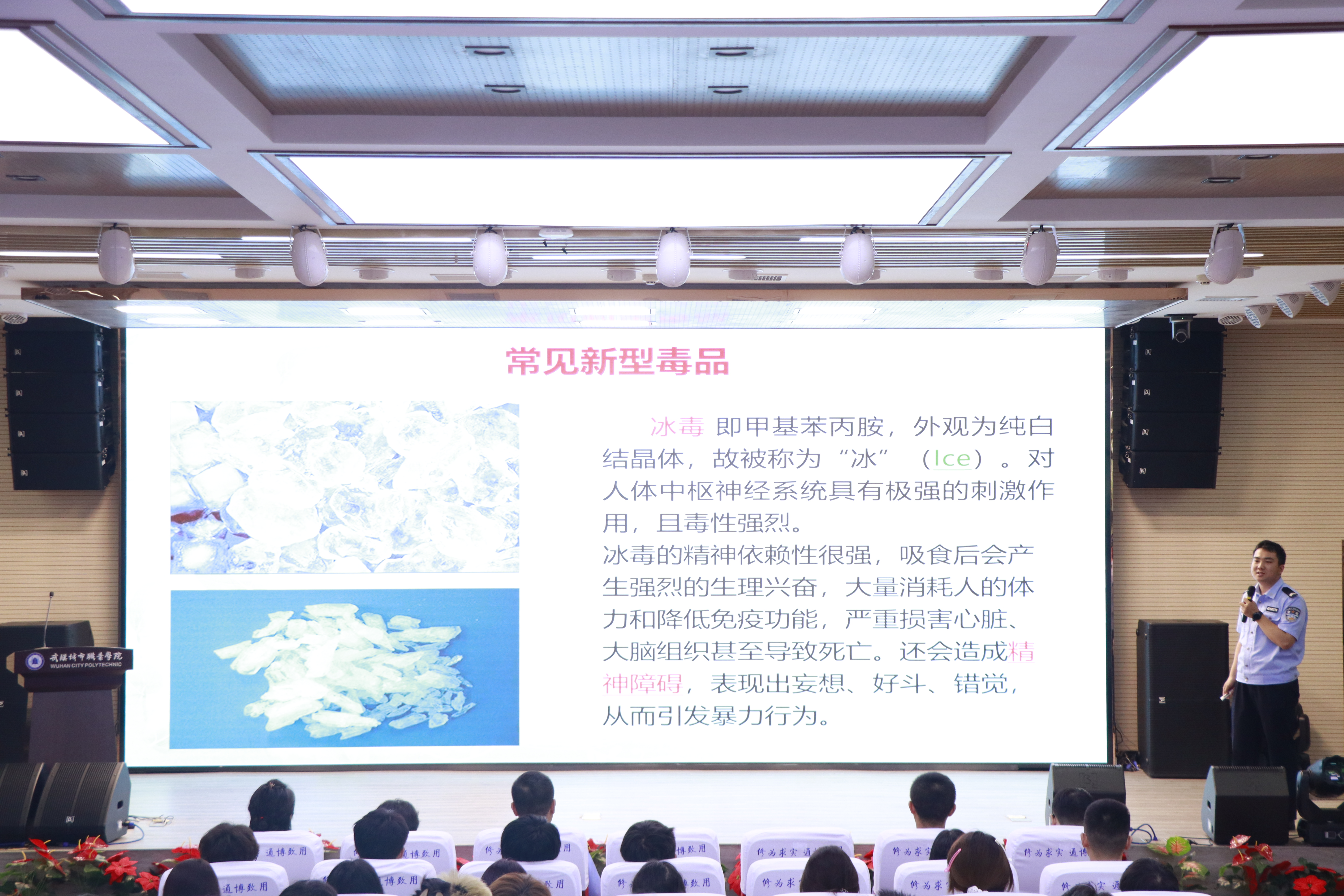 湖北省狮子山强制隔离戒毒所民警冷秉卓从林则徐虎门销烟的历史故事入手,向师生们详细讲解了毒品的种类、毒品的危害以及在日常生活学习中如何做好预防。在有奖问答环节,同学们踊跃举手发言,氛围热烈。
