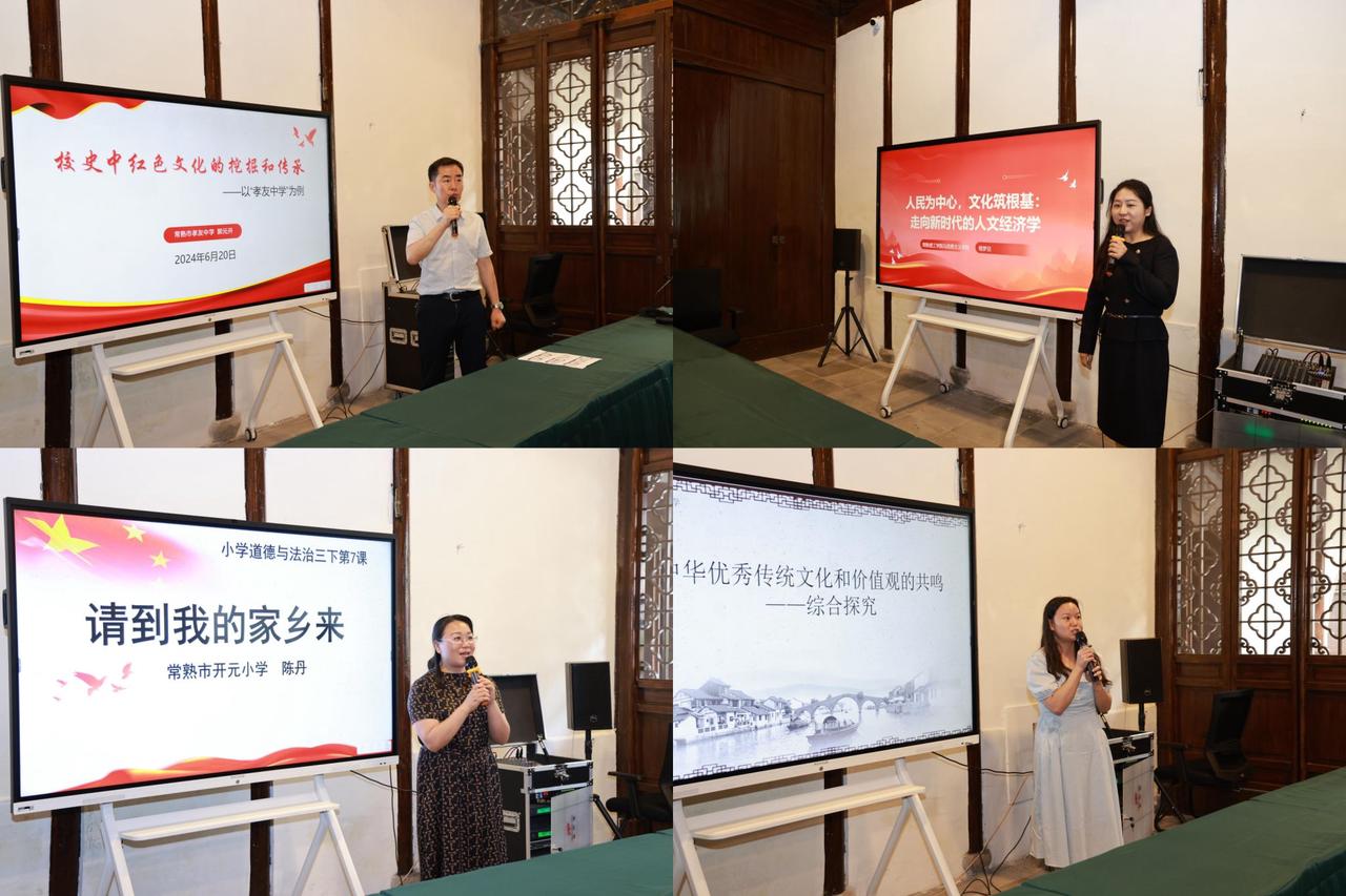 主题党日活动中进行了“地方红色文化融入思政课教学”展示。马克思主义学院钱梦旦老师以《人民为中心 文化筑根基》为题,探讨了“新时代人文经济学”框架下的多维、系统融合发展策略和模式。常熟市开元小学陈丹老师以“请到我的家乡来”为主题,生动讲述了在全国优秀共产党员、村党组织负责人常德盛的带领下,蒋巷村从“农业起家”到“工业发家”,再到“旅游旺家”的乡村振兴之路。常熟市孝友中学校长郭元开从学校红色基因、校训衍化的思考、校友故事的启示和红色文化传承的实践四个方面系统阐述了“孝贯人伦、友睦天下”的孝友精神。常熟市王淦昌高级中学徐望晨老师以“两弹一星”勋章获得者王淦昌的“科学报国”情怀和精益求精的科学精神切入,展示了“资料卡式”和“议学式”思政课教学创新模式。