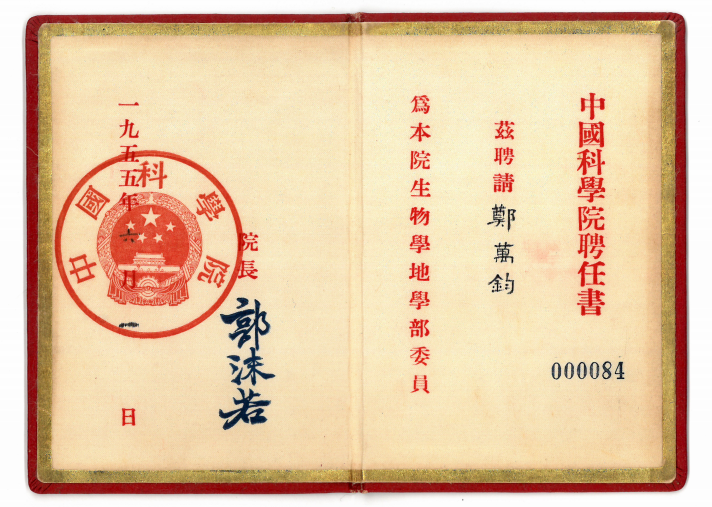 1955年6月5日,《人民日报》刊登中华人民共和国国务院令,公布第一批中国科学院学部委员名单,郑万钧教授为中国科学院生物学地学部(后为生物学部)学部委员。中国科学院第一次评选学部委员共设有三个学部,其中生物学地学部共84位委员,其中生物学领域60位,地学领域24位。生物学领域的这60位委员中生物学领域有31位,医学领域有15位委员,农学领域有14位,其中林学领域只有两位:梁希和郑万钧。这本学部委员证书非常珍贵,为郑万钧家属多年珍藏,此次无偿捐赠给南京林业大学,实乃学校之幸。