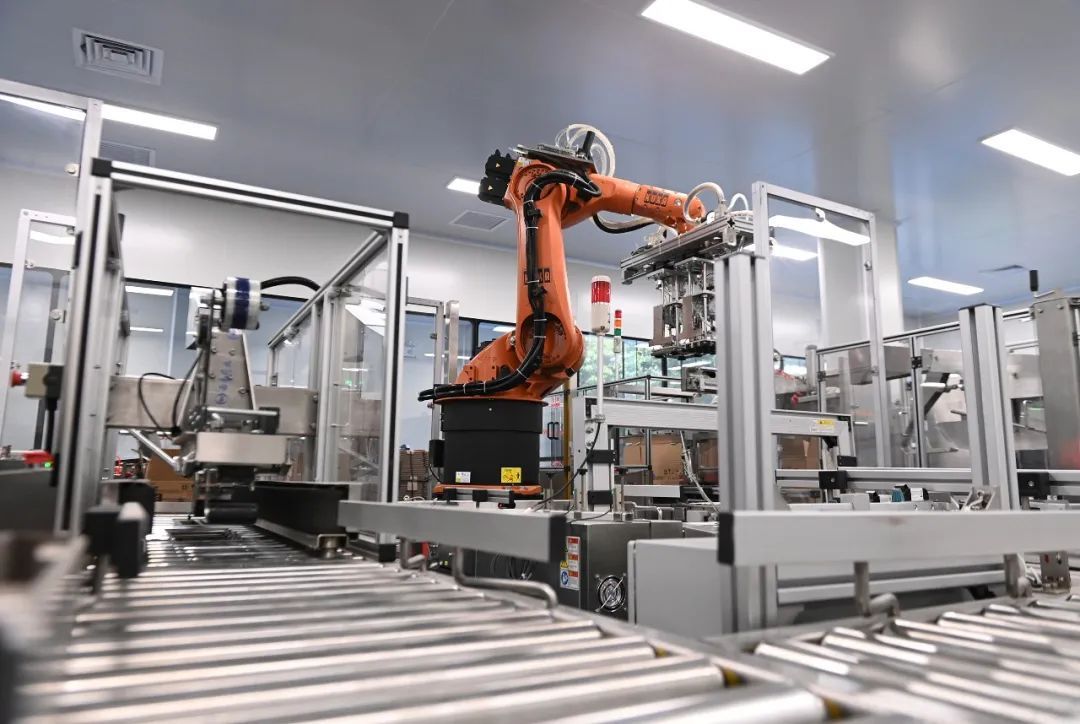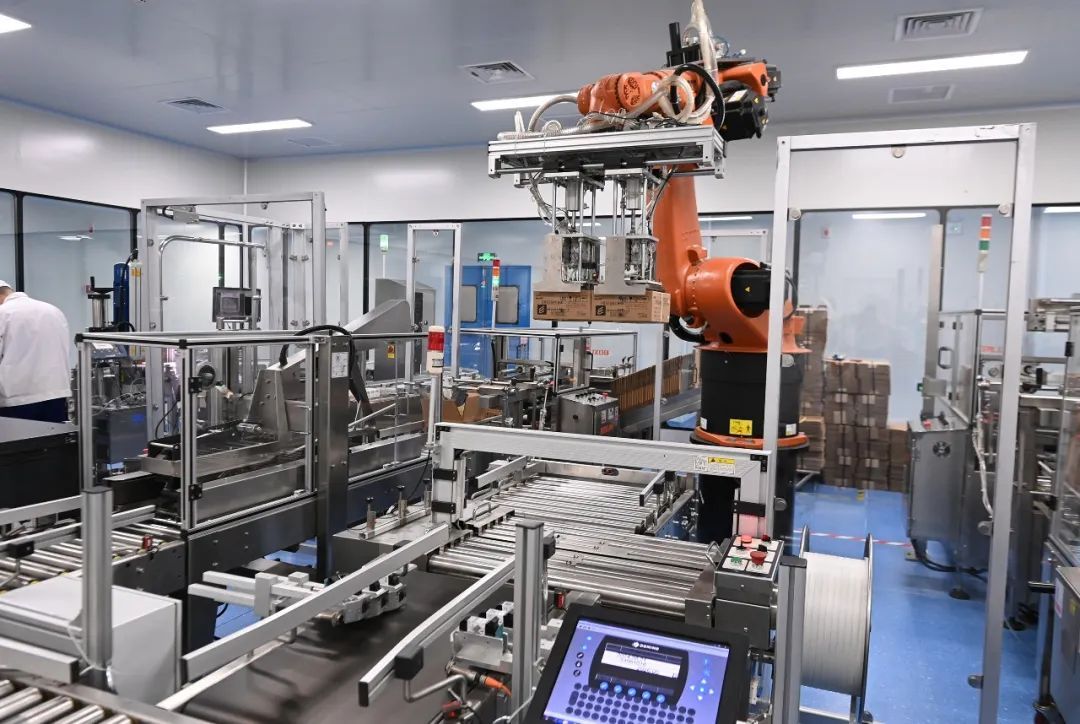 6月21日,国药太极西南药业股份有限公司的粉针剂车间5G生产线包装区,机械臂快速打包药品。孙凯芳/摄