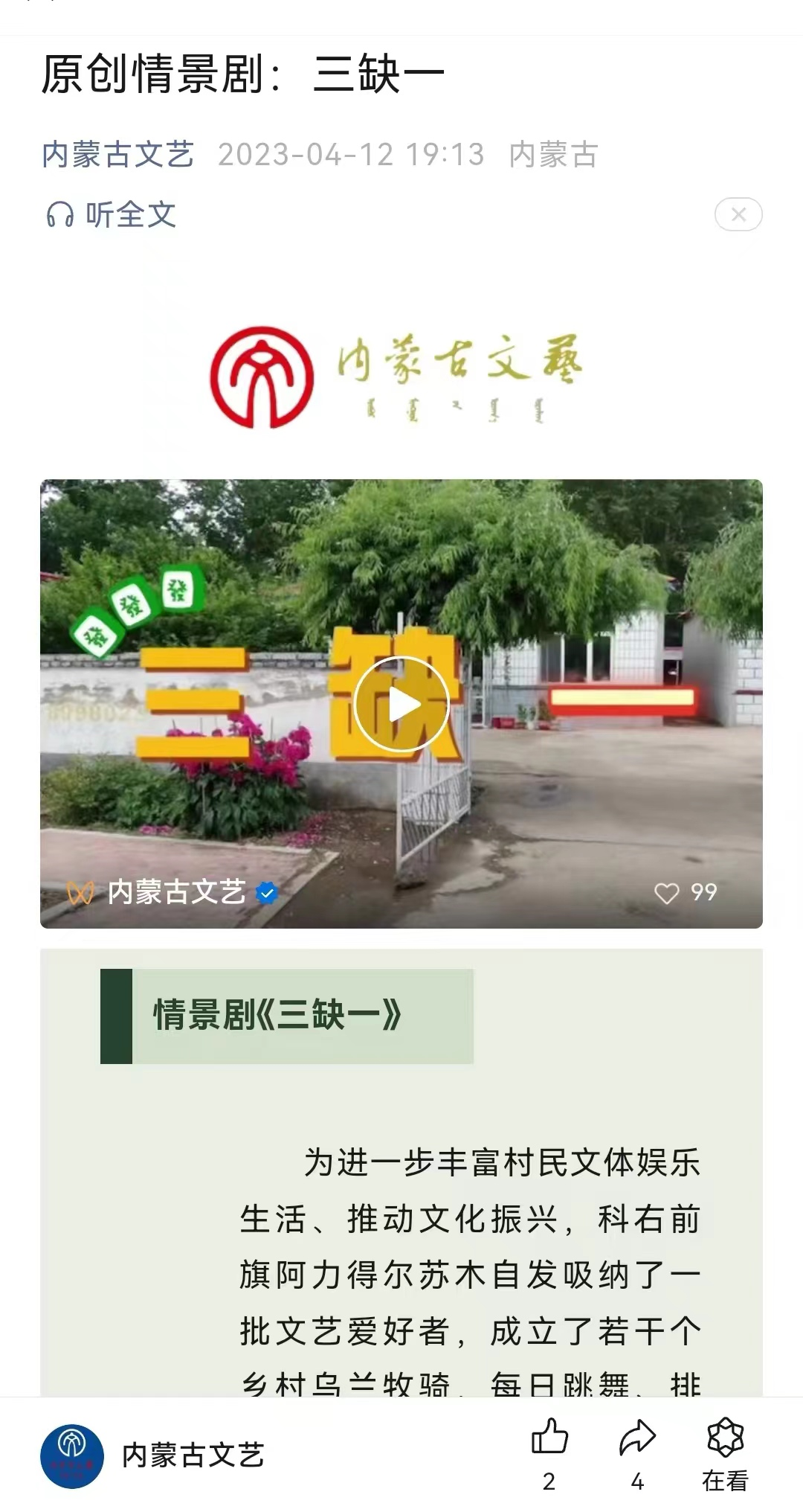 “唱美新山乡”,在乡村大舞台唱响“村歌嘹亮”,《蔚蓝的察尔森》入围2024内蒙古村歌大擂台展演。争取“村歌嘹亮”2024内蒙古村歌大擂台活动落地科右前旗,用歌声推动科右前旗“出圈”,推动兴安岭上兴安盟域牌“走出去” 。
