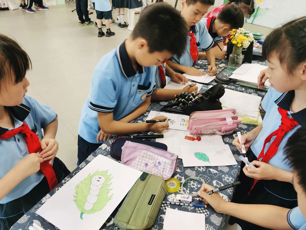 6月20日,杭州市桃源小学基于STEAM课程主题,开展了名为“立夏桑蚕‘源’创馨家”的非纸笔项目式学评。桑蚕书社(语文)、喂养工坊(数学)、 缫丝工坊(科学)等六大摊点,通过蚕宝宝词语接龙乐、蚕盒创意表达show、小小饲养员等环节全面考察学生的核心素养,实现学生综合素质的提升。