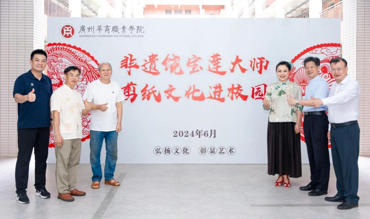 国家级非物质文化遗产项目(广东剪纸)省级代表传承人饶宝莲大师,宝莲剪纸艺术顾问陶瓷工艺美术大师杨许鄂,广州华商职业学院执行董事杨群祥、党委书记翁礼成、常务副校长袁国繁、副校长孙虎以及师生代表出席了本次活动。