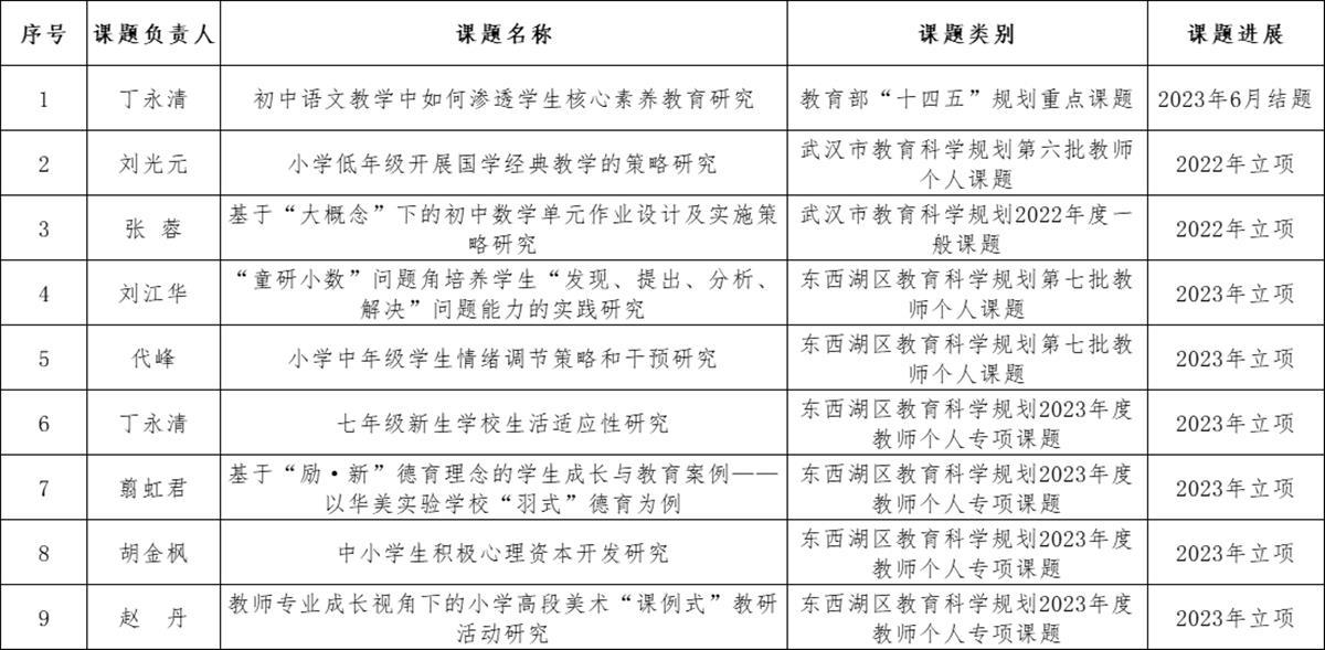 办学六年以来,全体师生员工同心同德、开拓进取,学校捷报频传,硕果丰登,开创了学校高质量发展的新局面。目前,学校已有9项课题成功立项,其中丁永清老师的教育部“十四五”规划重点课题《初中语文教学中如何渗透学生核心素养教育研究》于2023年6月成功结题,并荣获教育部教育科研成果一等奖。舒慧君老师获全国青年教师专业基本功大赛二等奖。赵丹老师获全国第七届中小学生艺术展演活动指导教师二等奖、2023年全国中教杯教师技能大赛一等奖、第35次学术年会论文评比湖北省教育学会二等奖。“华美羽式德育”获全国名班主任工作室联盟品牌班主任工作室授牌。