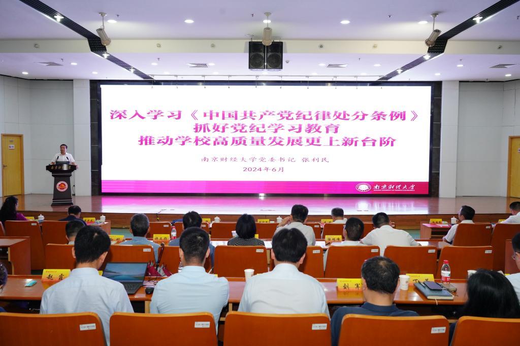 6月28日下午,南京财经大学党委书记张利民在仙林校区图书馆一楼报告厅为师生讲授题为“深入学习《中国共产党纪律处分条例》 抓好党纪学习教育 推动学校高质量发展更上新台阶”的党课。全体校领导,全体党委委员、纪委委员,全体中层干部,基层党支部书记代表,新发展党员代表等参加党课学习。