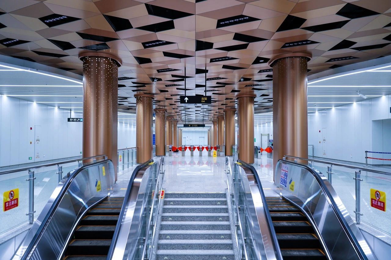 在中铁十四局承建的琼姬墩站,站厅金色立柱上繁星点缀,如华灯初上的苏城,灯光与星光交相展现出别样繁华。