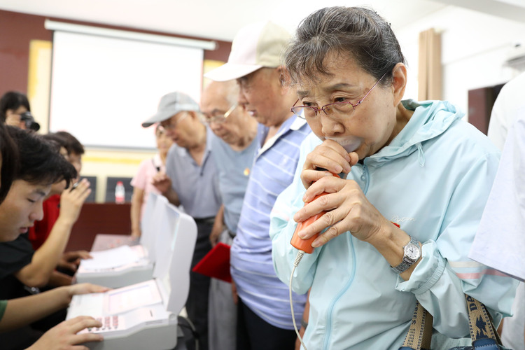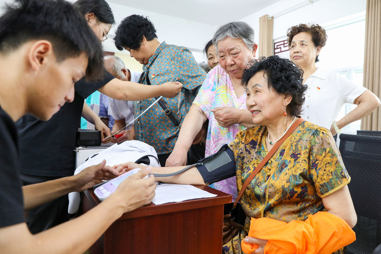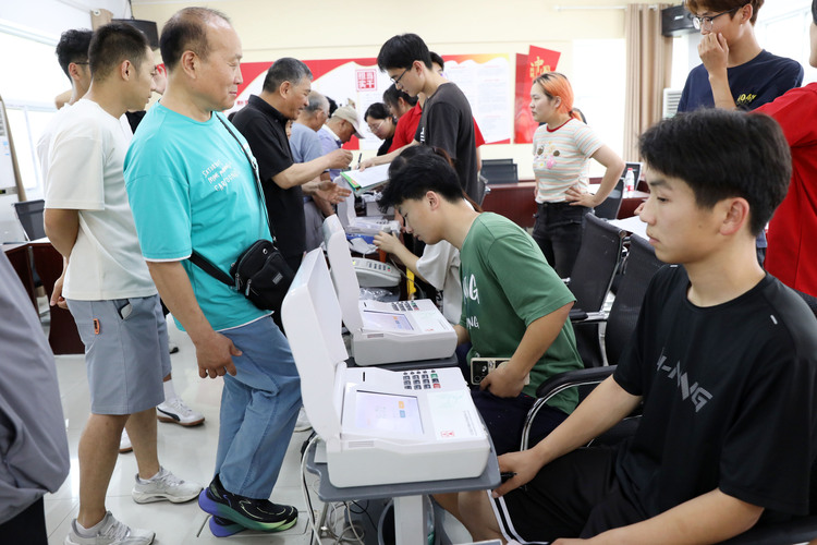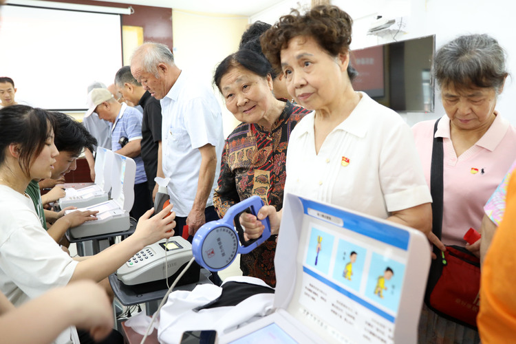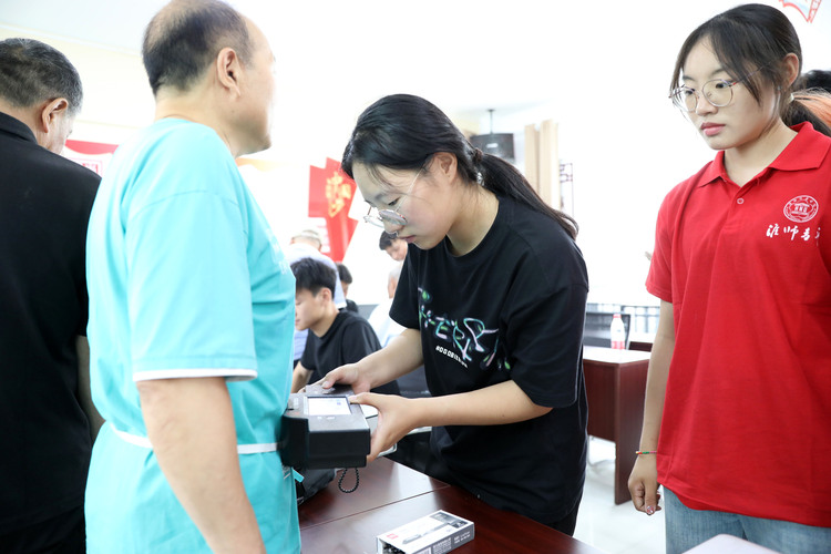 在社区活动中心,大学生们为老党员量血压、称体重、测肺活量及灵敏度等,利用全新的体质健康测评系统为老党员们进行体质健康评估,并立足健康游戏训练方式开展趣味体育知识普及和传播。