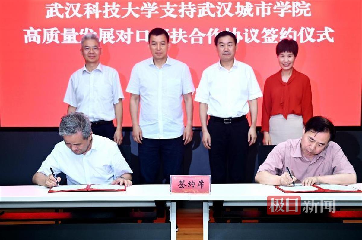 7月1日下午,武汉科技大学支持武汉城市学院高质量发展对口帮扶合作协议签约仪式在武汉科技大学图书馆隆重举行,两校携手开启合作新里程。武汉科技大学党委书记徐雁冰、党委副书记孙国胜,武汉城市学院董事长吴文刚,武汉城市学院校长陈建勋,武汉外语外事职业学院校长盛建龙,武汉外语外事职业学院董事长吴翠红和武汉城市学院全体校领导出席签约仪式。签约仪式由武汉城市学院党委书记肖军主持。