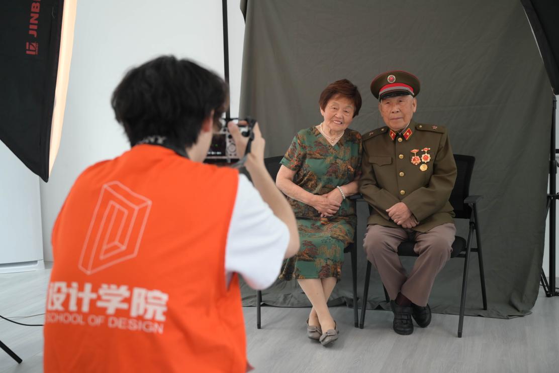 为赓续红色血脉,弘扬革命精神,培养有理想、敢担当、能吃苦、肯奋斗的新时代好青年,设计学院党总支组织专业骨干教师发挥学科特色优势,推进“第一课堂”和“第二课堂”的有效衔接,以专业服务社会,用实践奉献社会。学生社团“寻影社”积极投身社会实践,用镜头记录时代变迁和人民美好生活,开展了南京鼓楼区五塘村社区在党50周年纪念肖像拍摄、桥林街道敬老院老人肖像拍摄等“红色传承”系列活动后,近期“寻影社”社团深入南京市鼓楼区北崮山社区,为三对老红军夫妇拍摄金婚纪念照,用光影记录他们相濡以沫的爱情故事,传承前辈身上流淌的革命精神。“寻影社”社团还在校内举办了“最美民族照”活动,通过摄影艺术展示少数民族学生的风采,传播各民族的独特文化,促进民族团结与文化交流,助力铸牢中华民族共同体意识。这些实践活动不仅锻炼了学生的专业技能,更引导他们在实践中深刻领悟为业之基的重要意义,为将来的职业生涯和社会担当奠定了坚实的基础。设计学院师生以行动实践,展现了新时代青年奋发进取的时代风貌。