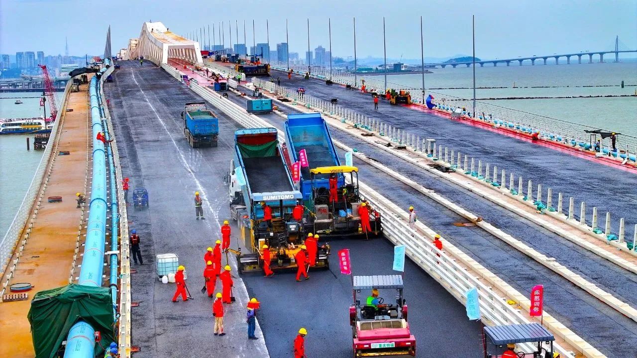 在近三年的建设中,大桥施工经历多次暴雨、台风等极端天气。联营体成立5个突击队,在做好安全风险管控和应急工作前提下,灵活有序调整建设工期,提前完成11.7万平方米桥面沥青铺装任务,有力保障大桥的顺利完工。