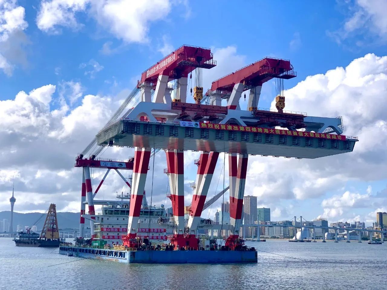 钢梁架设是大桥建设的难点之一。澳门大桥邻近澳门机场,存在航空限高要求。为此,项目联营体在起重船“铁建大桥起1号”设计阶段,充分考虑了航空限高、复杂工作水域等限制因素,对关键部件和相关性能进行定制化改造升级,确保重大海上施工装备安全平稳精准高效推进钢梁架设。