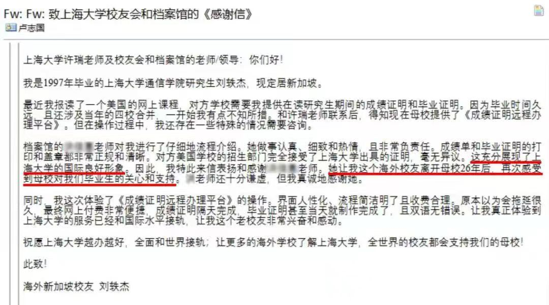 档案馆与校友办通力合作,深入探讨服务校友新模式,于2022年12月开通服务校友“绿色通道”,为校友提供贴心便捷的档案利用服务,让校友感谢母校温度。绿色通道得到了校友的一致好评,有校友发来感谢信,感谢母校的关心和支持。