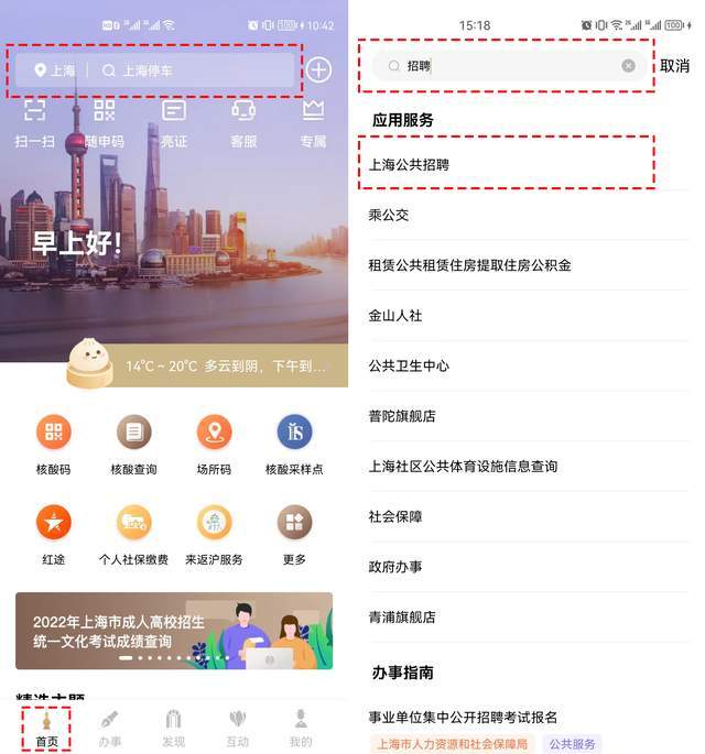 求职者可以登录“随申办市民云”APP→首页搜索框中输入关键字“招聘”→点击“上海公共招聘”进入服务