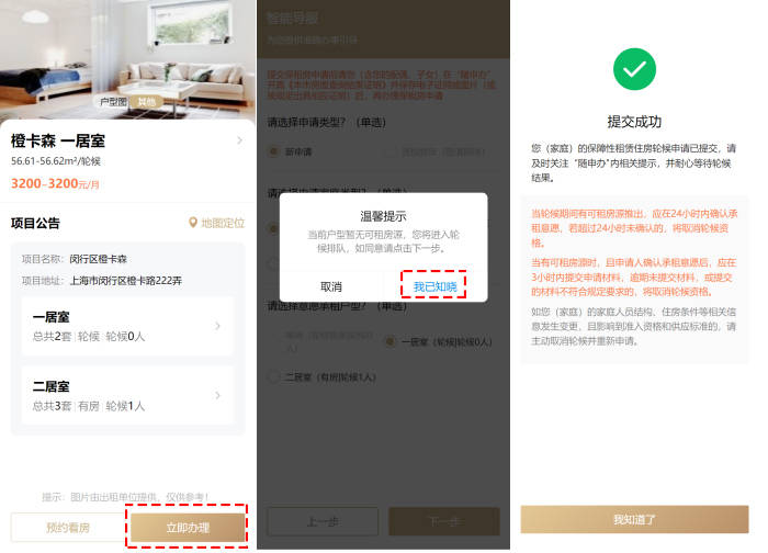 若当前户型暂无可租房源,可填写轮候申请表单,提交轮候申请,当前不支持本市拥有产权住房或承租公有住房申请人参与轮候