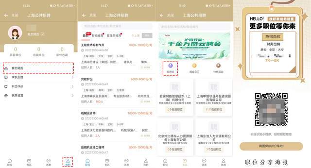 支持在线创建“个人简历”、筛选岗位、投递简历、查看最新线下招聘会、分享应聘职位信息等多项功能服务