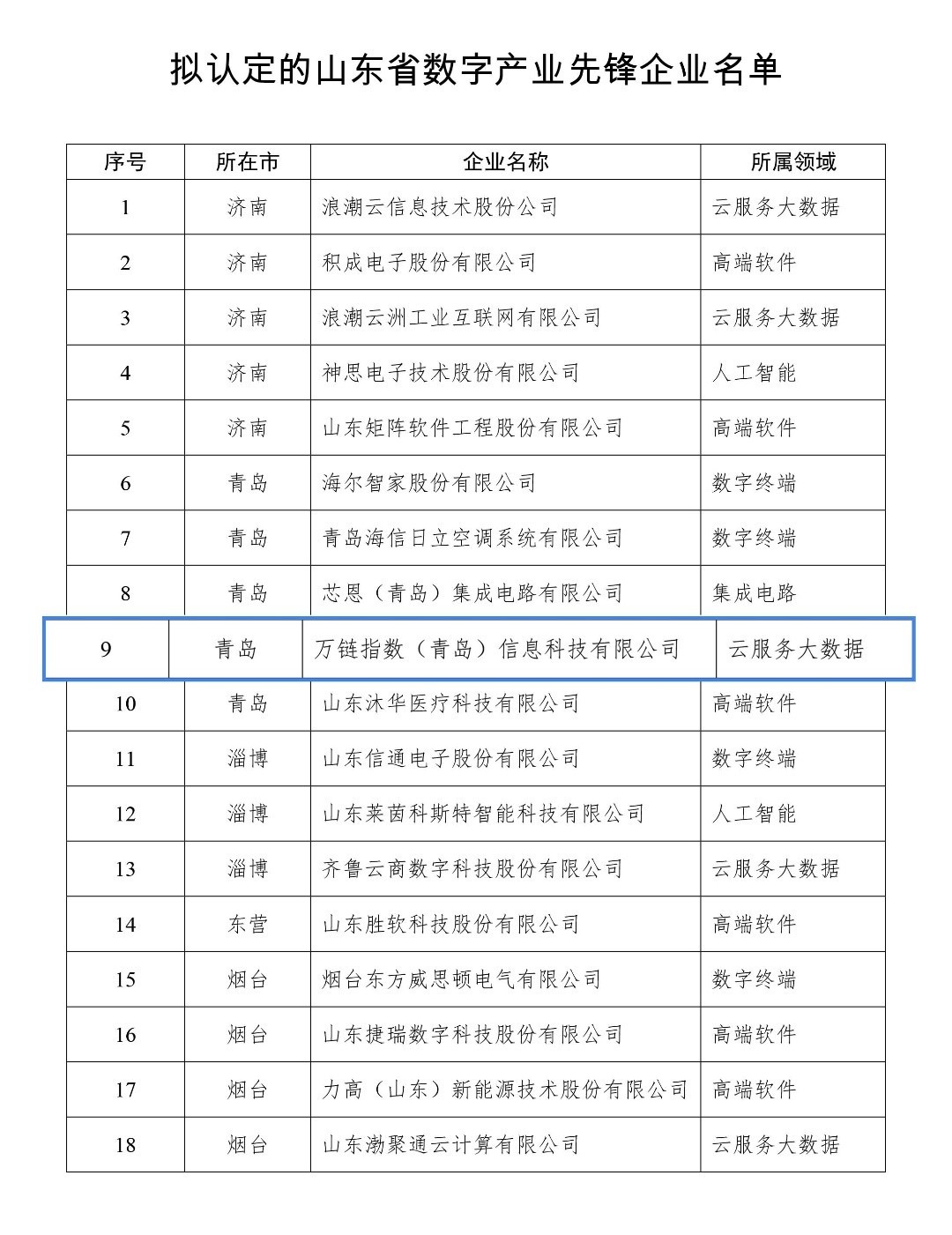 近日,山东省工业和信息化厅公示了首批山东省数字产业先锋企业名单,青岛地区共5家企业上榜。其中,万链数科生态内企业万链指数(青岛)信息科技有限公司凭借领先的技术优势和创新能力,作为全市唯一一家云服务大数据领域企业跻身全省30家先锋企业之列,一同入选的还有浪潮云、海尔智家、海信日立等知名企业,是山东数字经济“走在前、开新局”的力证。