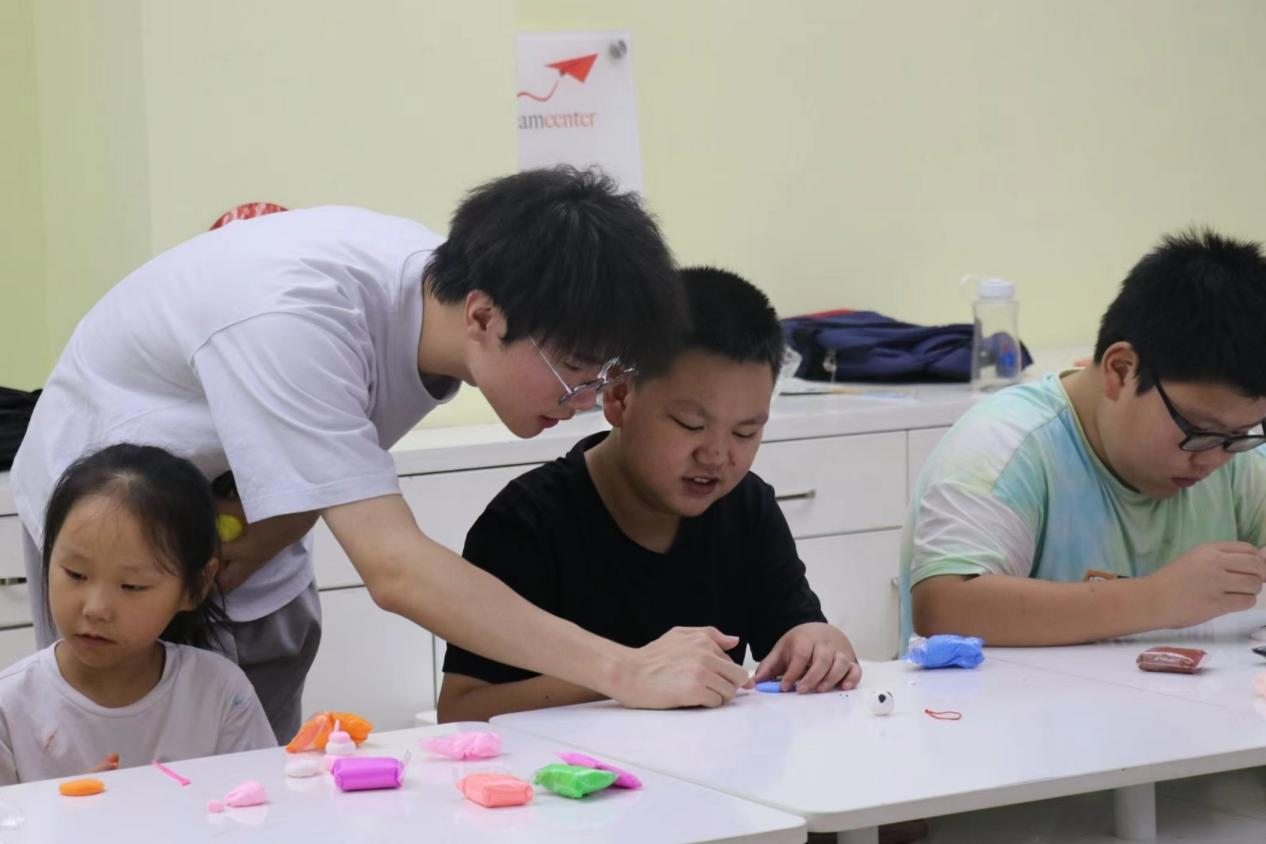 同学们在“奋楫者”实践团成员帮助下进行手工制作
