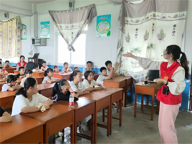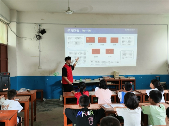 午后,支教队员们带领小朋友们进行唱歌,朗诵等娱乐活动,他们还精心准备了一堂生动而深刻的红色教育课,旨在让孩子们在心灵深处种下爱党爱国、铭记历史的种子。在课堂上,志愿者们引领孩子们走进了红色文化的殿堂。他们通过展示各种旗帜的图片,耐心细致地讲解了党旗、国旗、军旗、团旗以及队旗的象征意义和历史背景,激发了孩子们对国家和民族的自豪感与责任感。他们通过讲解英雄人物故事,调动孩子们的情绪,引导孩子们分享爱国启示。他们为孩子们拓展课外知识,让孩子们在学习中厚植爱国爱党的浓厚情感,弘扬爱国主义精神,树立正确的价值观。