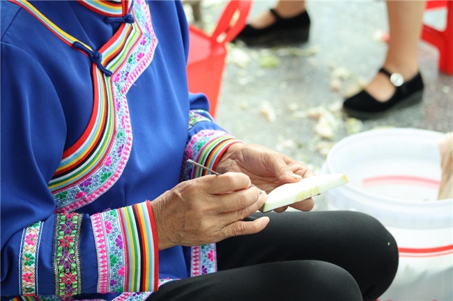 通过广西艺术学院在读硕士李沸莹的介绍,我们深入了解了当地雕花蜜饯的制作工艺。雕花蜜饯以未成熟的青皮柚子为原料,先将柚子处理成圆形或扇形的均匀薄片,再在柚皮上雕刻各种图案,经过沸煮、腌糖、晾晒等多道工序制造而成。队员们还在现场近距离观摩了雕花蜜饯传承人们的精湛技艺,柳叶刀翻飞之下,掉落于地的青涩柚皮静静躺在侗族人民的脚边,注视着时光流淌间代代变化的面孔,这一刻,不仅让我们感受到中华文化的精深与厚重,更让我们意识到非遗传承与文化保护的重要性。