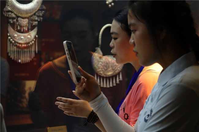 跟随着李同学的脚步,队员们来到了博物馆三楼,聆听着此间延绵千年的传承故事,感受着靖州苗族侗族自治县浓厚的文化氛围。静立于展柜的苗、侗服饰,诉说着彼此民族文化的交融;陈列于馆内的手制侗琵琶,琴弦间仿佛在缓缓流淌着非遗的乐章.....