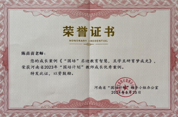 该校“国培计划”学员陈苗苗老师,作为全省唯一的参训学员代表,在2024年河南省“国培计划”管理者高级研修班上做了《“国培”启迪教育智慧 且学且研育梦成光》的发言。