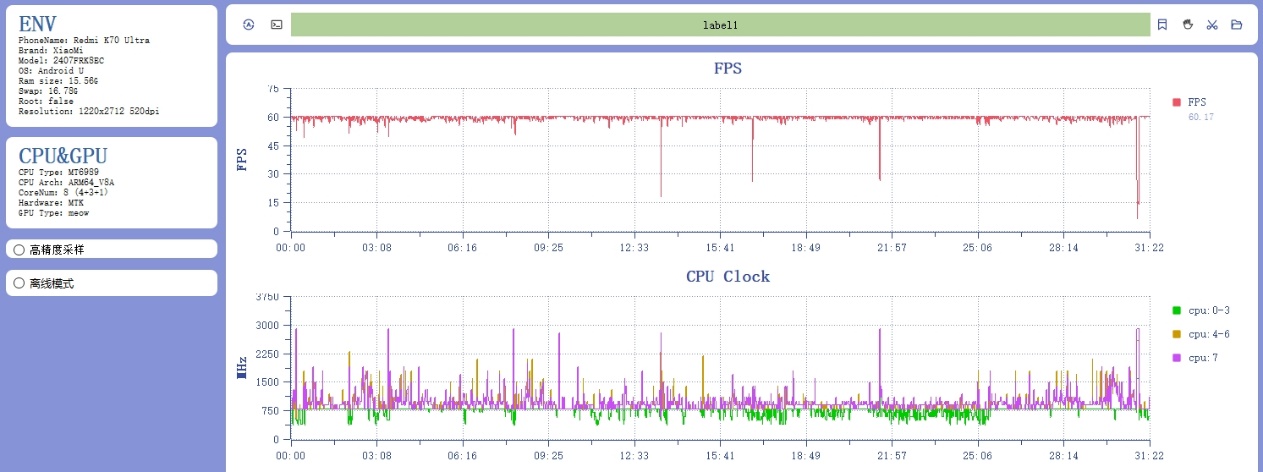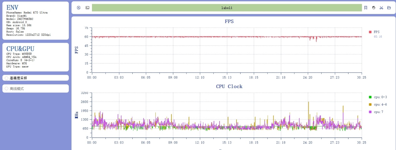 实际游戏测试下,直接上最耗费性能的测试《原神》和《崩铁》。30分钟须弥跑图,平均帧率59.78FPS,整个过程没有明显的帧率波动,也没有因为发热而降频。