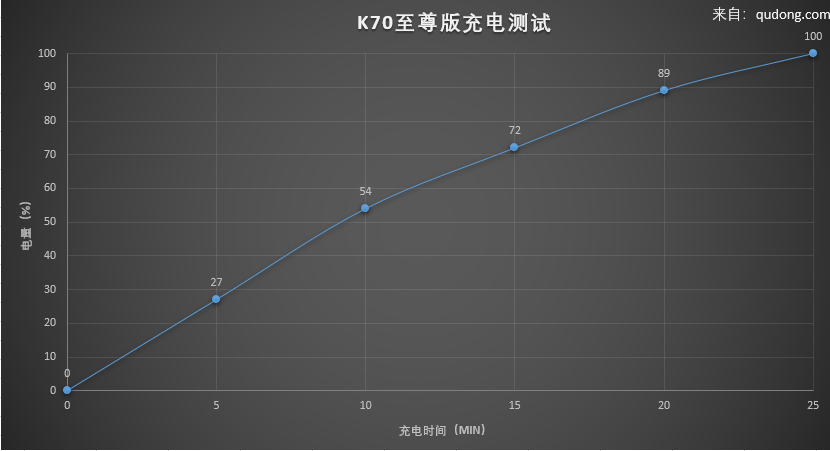 充电速度在极速模式下,实测K70至尊版5分钟充电27%,从关机到充满,只需要25分钟。