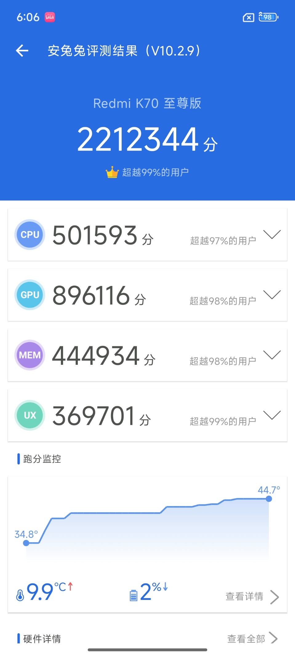 首先看看K70至尊版的理论性能释放表现,实测安兔兔跑分超过220万,登顶安卓第一,不愧为性能魔王。