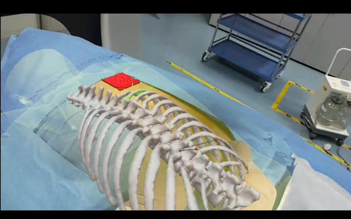 为此,医疗团队决定利用混合现实技术(MR)完成此次脊髓电刺激植入术。MR技术通过术前CT成像,建立可视化模型、设定好穿刺路径后,将模型导入可佩戴设备中,实现了手术室中的全息影像和现实手术相互融合。按照术前设定好的穿刺路径实现可视化的操作,就像给医生装上了“透视眼”,使操作更为安全、精准,穿刺中还能最大程度减少术中X射线扫描时间。
