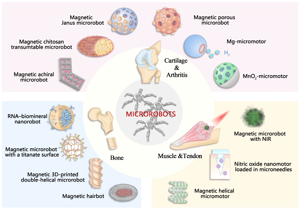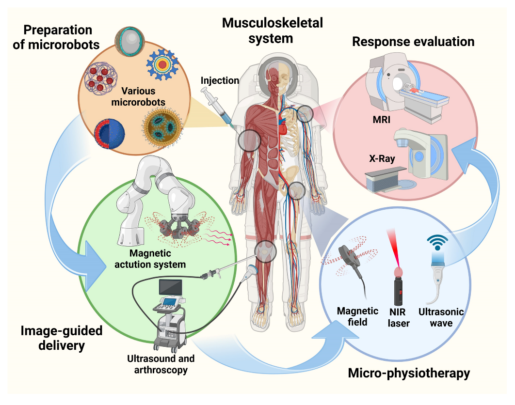 肌肉骨骼系统疾病是造成全球疾病负担的主要原因,目前的治疗方法疗效有限。患者经常遭受慢性疼痛,最终可能不得不接受终末期手术。因此,未来的治疗应注重对局部病变的早期发现和干预。微机器人以其智能、精准、微创的靶向输送优势,逐渐在生物体中得到应用。通过控制和成像系统的结合,可以将具有良好生物安全性的微机器人运送到所需的区域进行治疗。在肌肉骨骼系统中,微机器人主要用于运输干细胞/药物或清除体内有害物质。与传统的生物材料和组织工程策略相比,主动运动提高了细胞/药物局部靶向的效率和渗透。