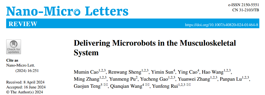 近日,东南大学附属中大医院滕皋军院士团队骨科芮云峰教授联合东南大学机械学院王乾乾教授,在微纳领域国际顶级期刊《Nano-Micro Letters》(中科院一区)发表了题为“Delivering Microrobots in the Musculoskeletal System”的研究成果,在国际上率先对近年来微机器人在肌肉骨骼系统中的应用进展进行系统综述,重点介绍了用于组织再生的微机器人系统的设计策略。回顾了肌肉骨骼系统中微型机器人的制造,驱动和控制以及成像引导,并讨论了微机器人在肌肉骨骼系统和再生医学中未来临床应用的前景和挑战。