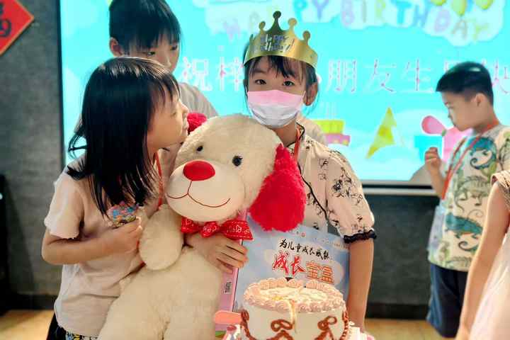 上午的课程在一片欢声笑语中结束,然而对于小怡来说,这一天格外特殊——今天她8岁了!当活动室的灯光渐渐暗下,大家一起参与布置生日会场。小怡由小朋友们手牵手带到生日会的现场,大家一起为她唱起了生日快乐歌。小朋友们的笑脸和生日蛋糕上的烛光在她眼前闪烁,温暖而明亮。