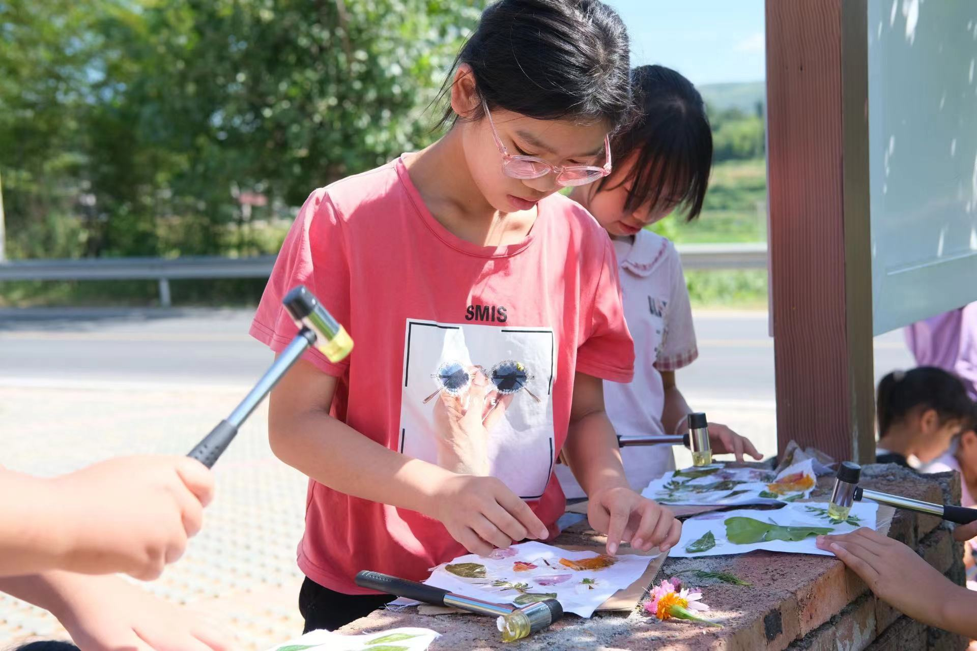 近日,在湖南省邵阳市新宁县马头桥镇坪山村,几十个小朋友在分散在田间,挥舞着胶头锤卖力地敲击手下的植物。一片片花瓣、叶片被小朋友们锤进纱布,留下清晰可见的植物纹理和脉络。