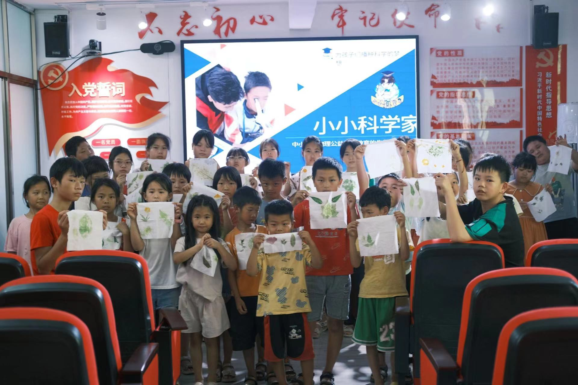 原来,这是长沙理工大学物理与电子科学学院“小小科学家·科普创造营”社会实践团的成员在带领坪山村的小朋友们开展一堂“接地气”的生物美学课,利用田边的杂草和野花完成一幅幅属于这片山野的植物拓染画。