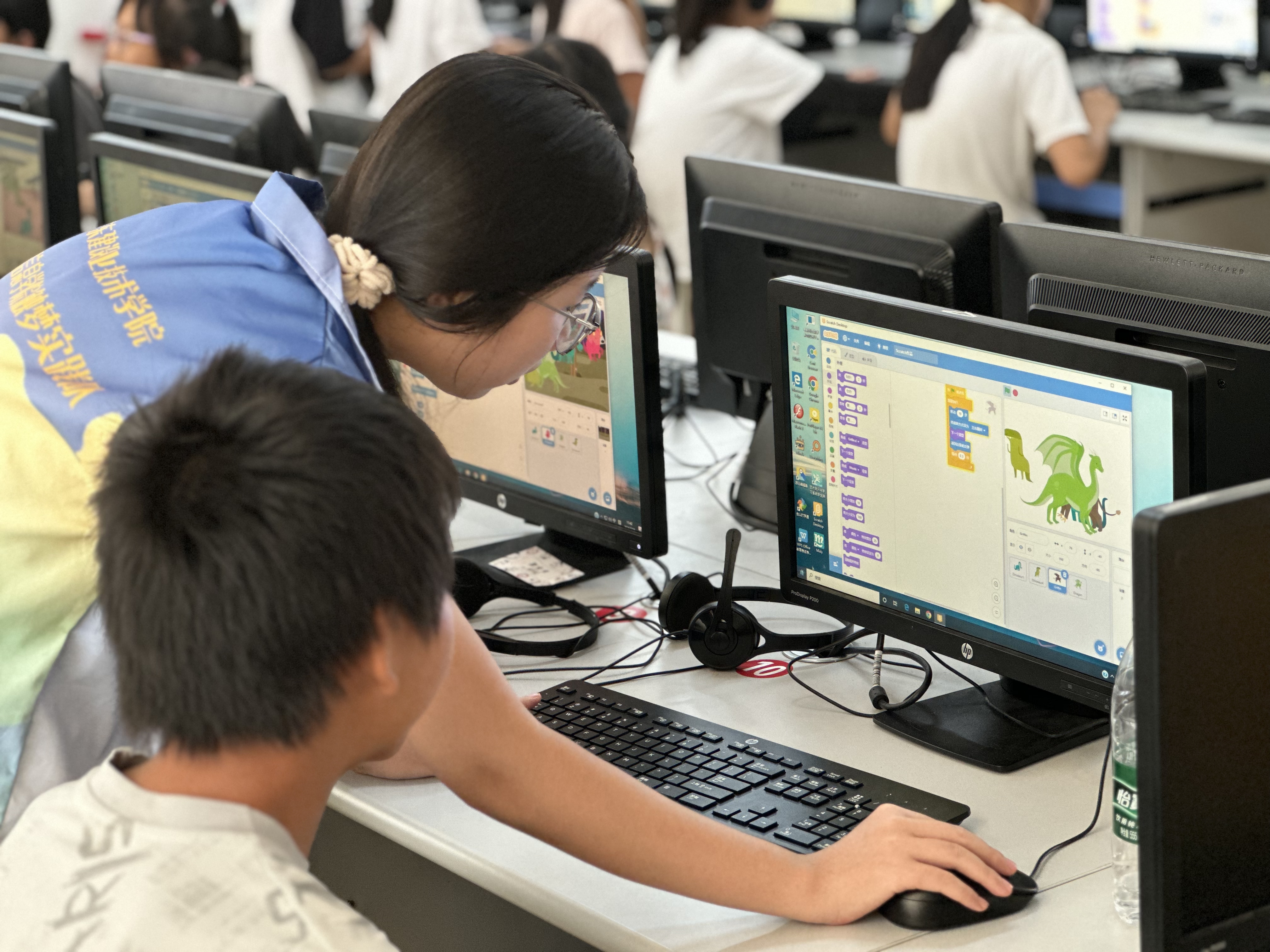 “触梦突击队”师生志愿者的专业涉及动画、数字技术、软件技术等,他们用自己的所学所知,专门为小学生科学安排了人工智能课程和少儿编程课等,用Scratch编程工具,教学生们编写简单的代码,创作有趣的小游戏和动画。通过生动的实例和互动教学,让他们走进神奇的编程世界。期间,志愿者还特地安排了一节人工智能观影课,播放《人工智能》影片。通过影片中的机器人小孩大卫寻求人类认同和爱的故事,深刻剖析了人工智能与人类情感的复杂关系,让学生们对AI的科技发展、伦理问题、法律问题等有了全新的认识。