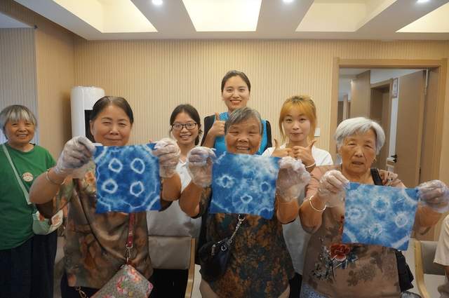 在福州路社区养老中心,扎染手工同样热闹非凡,支教团成员们耐心的向老人们讲解扎染的历史渊源和制作方法,老人们积极参与,动手折叠、捆扎,然后放入染料中浸染。当展开好的布料,看到那独一无二的图案时,老人们脸上绽放出了满足的笑容。马奶奶说:“这让我想起了年轻时候的手艺活,传统文化真是宝贵啊!我回去也要给我孙子玩玩!”
