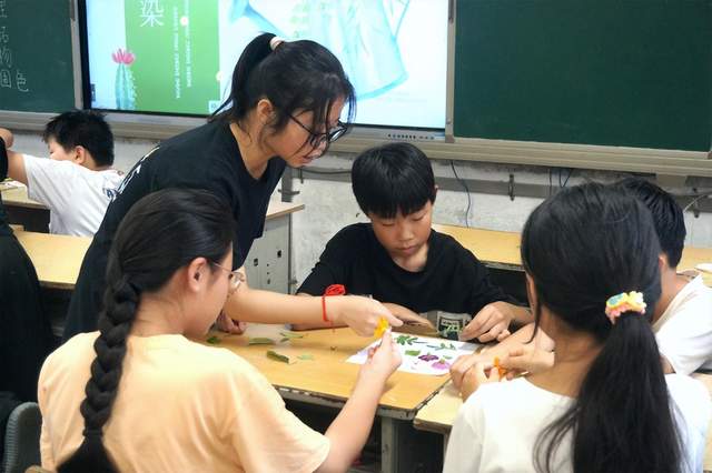 在蒋集九年制学校里,绿意与童趣交织,一场植物拓印的创意课程在此展开。支教团成员们悉心指导着孩子们,孩子们用一双双充满好奇与探索欲望的小手,精心挑选着形态各异的植物片叶。洁白的棉布上,植物的美丽轮廓和鲜艳色彩,在胶带固定与锤子轻轻敲打下,渐渐转移其上。当孩子们小心翼翼地将植物从棉布上取下,一幅幅充满自然之美的作品便惊艳诞生。“我从来没想到可以用这样的方式留住植物的美,太有趣啦!”一位同学兴奋的话语,道出了所有孩子的心声。
