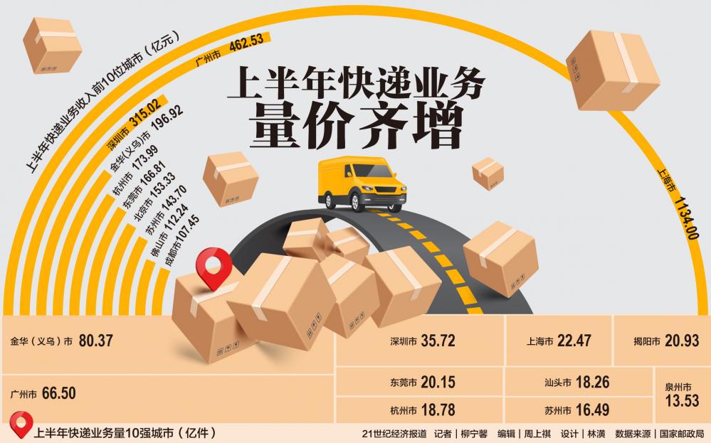 今年上半年快递业务量10强城市中,广东占了5席。上半年,这10座城市依次为:金华(义乌)市、广州市、深圳市、上海市、揭阳市、东莞市、杭州市、汕头市、苏州市、泉州市。