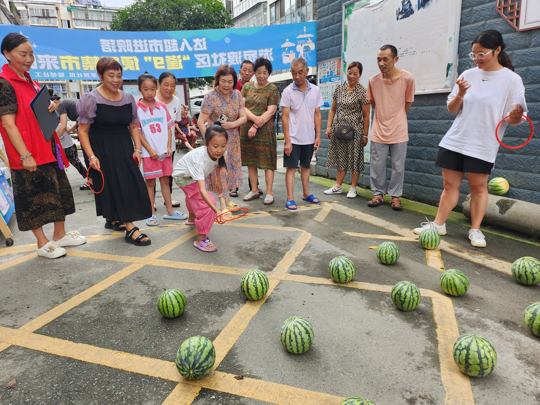 除了各类便民服务外,活动现场还设置了有趣的互动游戏。居民们只要在“一元市集”任意消费,便可参与套西瓜游戏。大家踊跃参与,将手中的圈圈小心地扔向西瓜,并相互分享套西瓜的心得和经验。随着游戏的进行,一只只圆嘟嘟的西瓜接连被带走,不少居民当场就与邻居们分享起了“奖品”,活动现场气氛热烈。在便民集市举办的同时,社区志愿者还走访了社区高龄老人和残疾老人,为他们送去消暑的西瓜。
