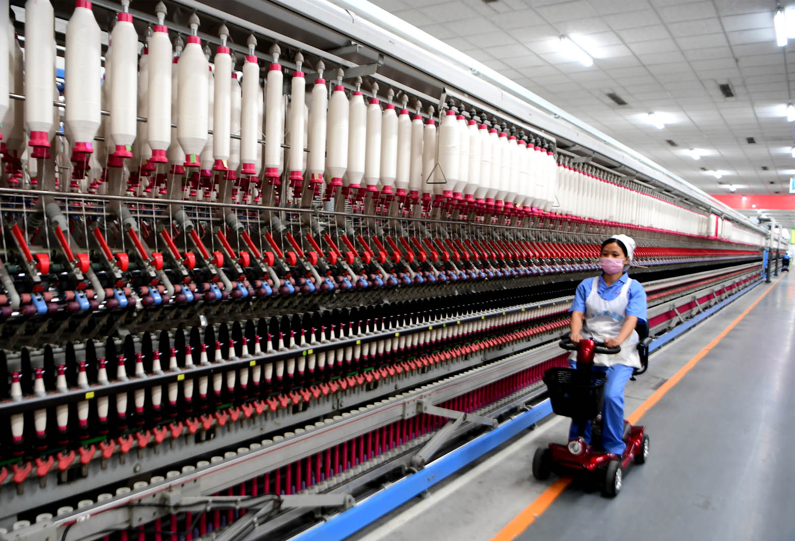 商丘益辉纺织有限公司的工人驾驶着智能电摩巡查生产。