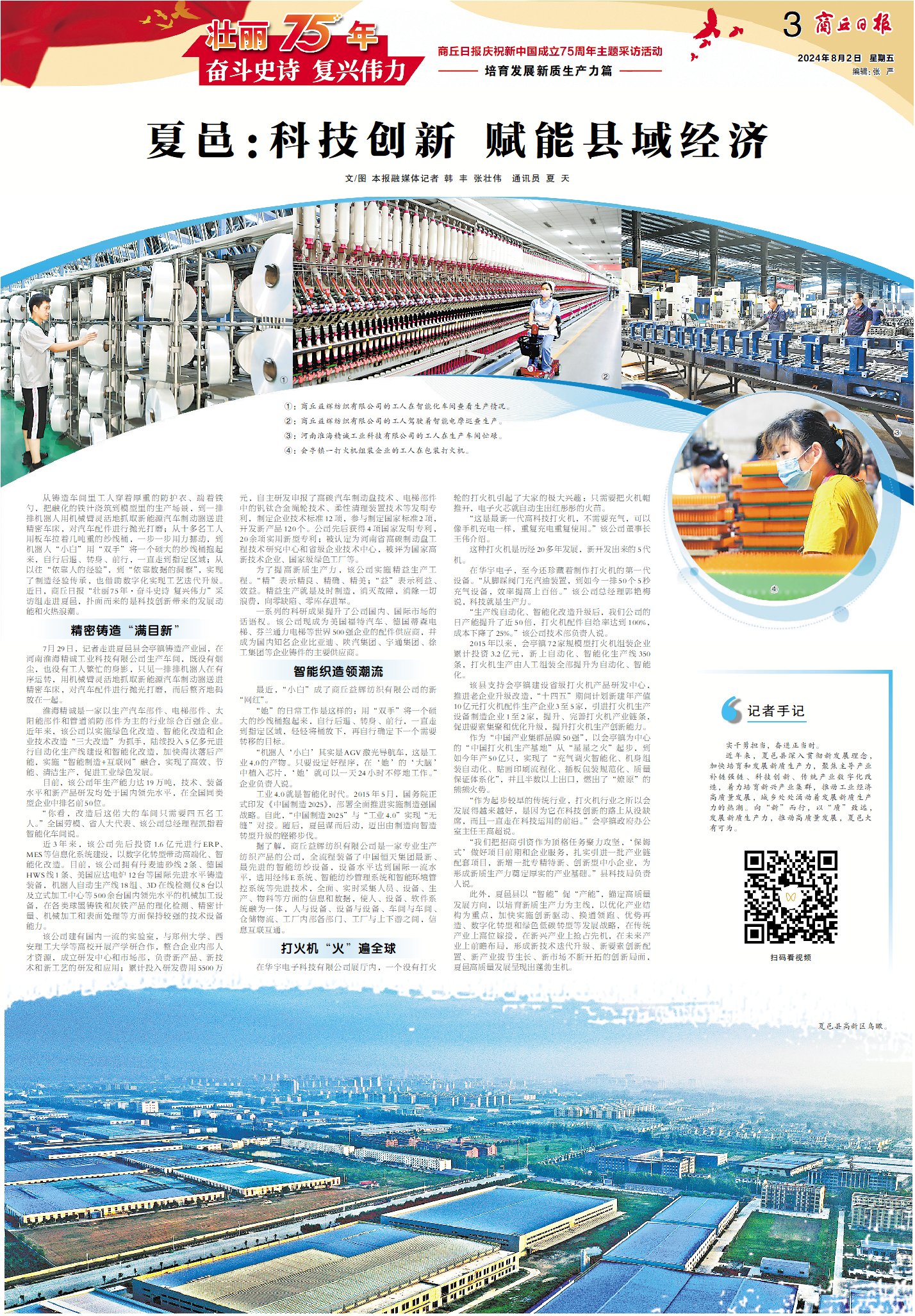 从铸造车间里工人穿着厚重的防护衣、端着铁勺,把融化的铁汁浇筑到模型里的生产场景,到一排排机器人用机械臂灵活地抓取新能源汽车制动器送进精密车床,对汽车配件进行抛光打磨;从十多名工人用板车拉着几吨重的纱线桶,一步一步用力挪动,到机器人“小白”用“双手”将一个硕大的纱线桶抱起来,自行后退、转身、前行,一直走到指定区域;从以往“依靠人的经验”,到“依靠数据的洞察”,实现了制造经验传承,也借助数字化实现工艺迭代升级。近日,商丘日报“壮丽75年·奋斗史诗 复兴伟力”采访组走进河南省商丘市夏邑县,扑面而来的是科技创新带来的发展动能和火热浪潮。