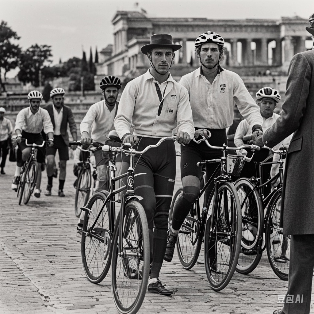 1896年雅典奥运会上出现了一个比铁人还铁的项目——12小时自行车赛。选手们需从凌晨5点就踏上自行车,不眠不休地骑满整整12小时,才能完成比赛。最终只有两人完成比赛,三名奖牌得主都没能凑齐,更有四名运动员在将近正午时昏昏欲睡跌下自行车。配图为AI根据实景生成
