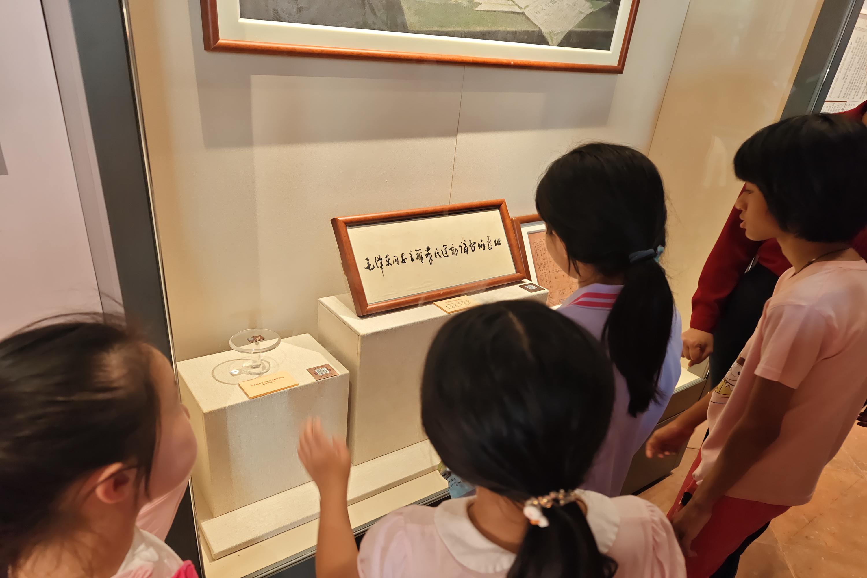 跟随讲解员的步伐,家长及小朋友们来到了第三陈列室,在这里小朋友们看到了由毛泽东同志亲自编写的《农民问题丛刊》等重要文献、镇馆之宝“广州农民运动讲习所证章”等历史文物,这些经由历史沉淀的物品承载着当时农讲所创办人的坚定信念和革命精神,让人不禁肃然起敬。