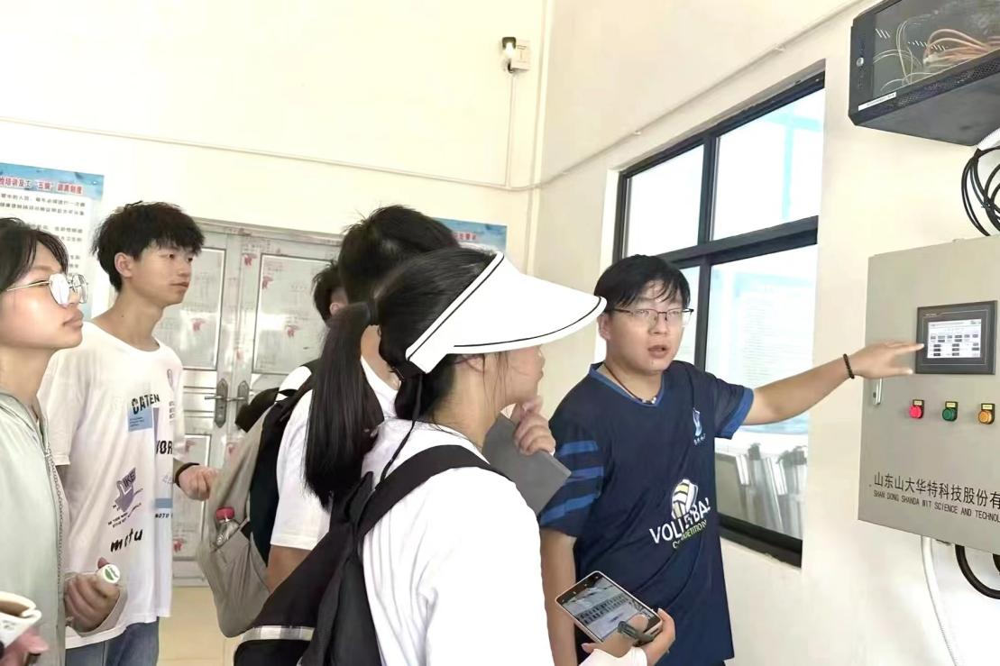 在祁阳城乡供水一体化一期工程大村甸水厂,水厂相关负责人刘韬带领实践团进入水处理设施库房,观摩水质净化全过程。此外,实践团还在水厂工作室体验了智慧水务在水厂运行过程中的广泛应用,智慧化、科技化保障水厂源源不断为城乡居民输送优质自来水。据了解,水厂自2019年通水以来,解决了29万群众的用水问题,实践团成员们深切体会到城乡供水一体化对于保证居民饮水用水的重大意义。