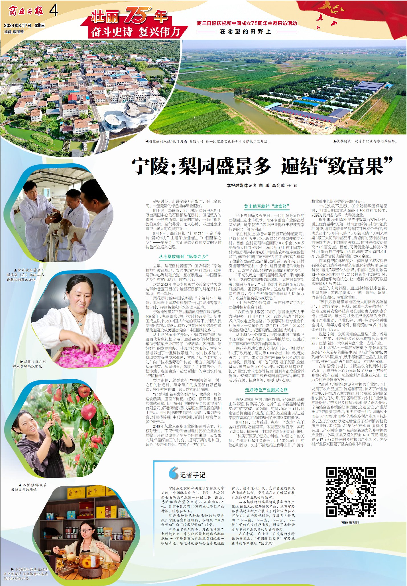 2024年8月5日,商丘日报“壮丽75年·奋斗史诗 复兴伟力”主题采访组走进“中国酥梨之乡”——河南省商丘市宁陵县,零距离感受蓬勃发展的乡村特色产业振兴之路。